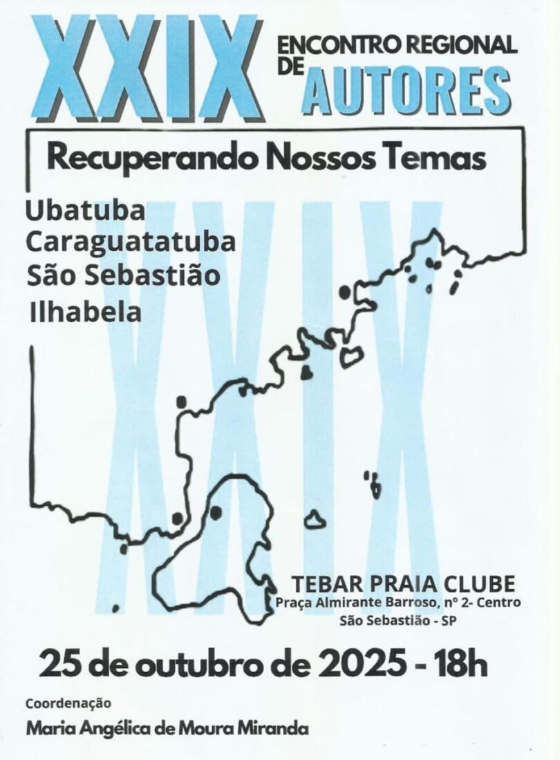 O “Encontro Regional de Autores” completa 29 anos e será realizado no dia 25 de outubro às 18h00, no Tebar Praia Clube, no Centro da cidade de São Sebastião – SP. O evento literário reúne os trabalhos dos escritores das cidades de Caraguatatuba, Ilhabela, São Sebastião e Ubatuba.
