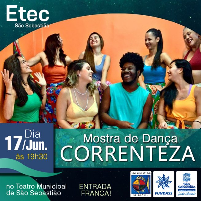 Neste sábado (17), a partir das 19h30, no Teatro Municipal, os alunos da 3ª turma do Técnico em Dança da Etec de São Sebastião – Classe Descentralizada Fundass, apresentarão a Mostra de Dança ‘Correnteza’, como resultado dos Projetos Interdisciplinares do curso.