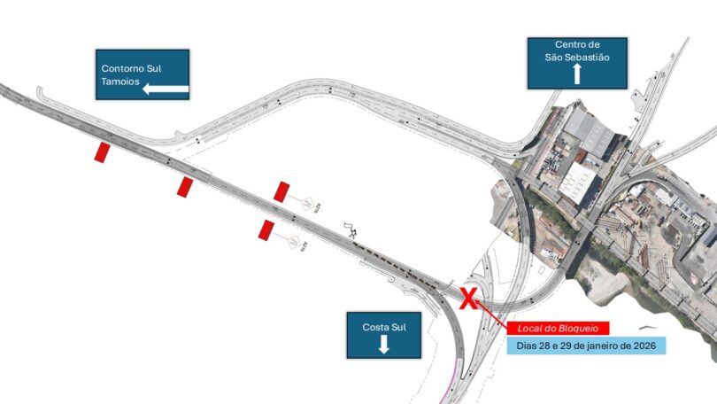 Concessionária Tamoios informa  bloqueio para a concretagem de lajes no km 33+900 Oeste do Contorno Sul (sentido Centro de São Sebastião), e os usuários serão destinados para o sentido do bairro da Topolândia (Maresias), em virtude da obra do novo acesso ao Porto de São Sebastião.