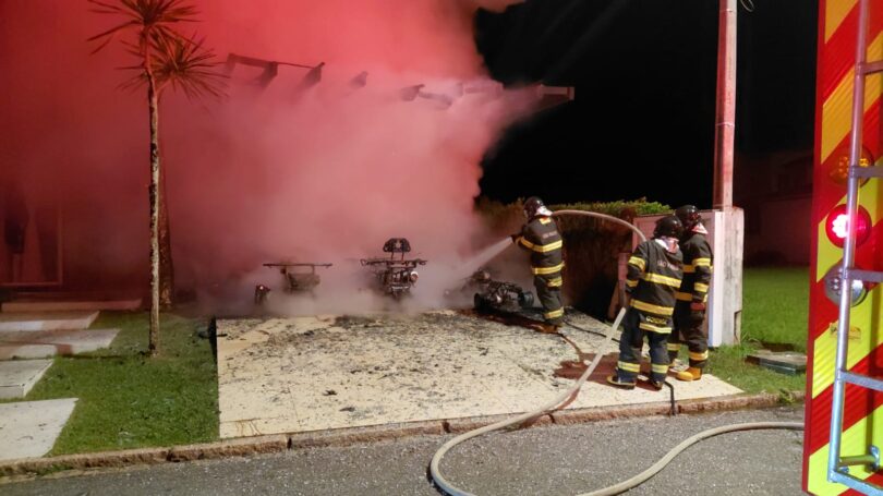 No local, foi constatado incêndio na garagem do imóvel, onde havia quadriciclos e duas motos elétricas. Os veículos e o pergolado que cobria a garagem foram totalmente consumidos pelas chamas.