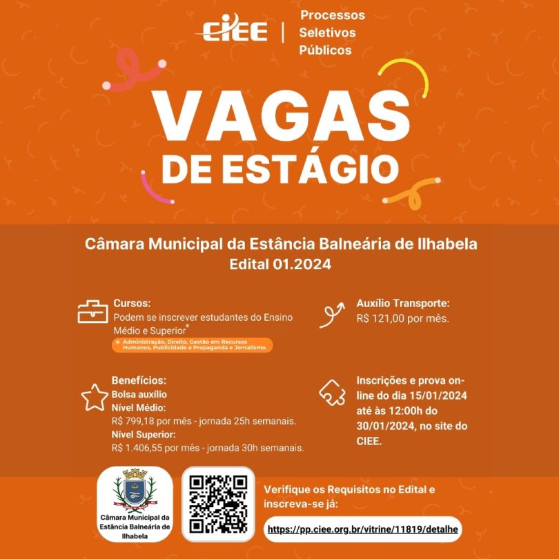 A Câmara de Ilhabela, em parceria com o Centro de Integração Empresa-Escola (CIEE), abre na próxima segunda-feira (15/01), processo seletivo on-line para formação de cadastro reserva para estagiários para alunos matriculados nos ensinos de nível médio e superior. As inscrições e provas on-line serão realizadas gratuitamente, no período de 15/01/2024 até às 12h do dia 31/01/2024, somente via internet pelo site www.ciee.org.br.