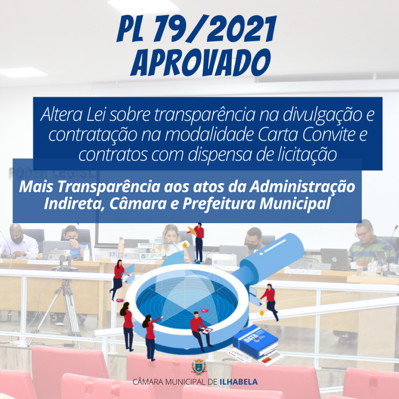 De autoria do vereador Felipe Gomes, o PL 79/2021, foi apresentado durante a fase de expediente da sessão ordinária e colocado em votação em extraordinária. A proposta altera dispositivo, determinando que, além do Poder Executivo, também fiquem obrigados a dispor no Portal de Transparência, em local próprio, todos os instrumentos convocatórios ou editais, e respectivos contratos, com antecedência mínima de 15 (quinze) dias antes da data da apresentação das propostas, o Poder Legislativo e as entidades da Administração Indireta, nos casos de contratação através da modalidade de Carta Convite, ou ainda contratação com dispensa ou inexigibilidade de licitação.
