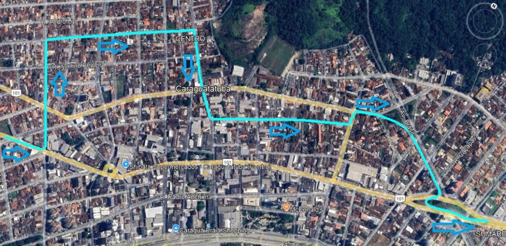Já os coletivos vindos da região norte e os que irão à região sul seguirão pela Avenida Presidente Castelo Branco, à direita na Avenida Brasil, à esquerda na Rua São Sebastião (Associação Comercial), Avenida Frei Pacífico Wagner (Câmara Municipal), Avenida Prisciliana de Castilho, à esquerda na Rua Sinésio Moreira Marcondes, à direita na Avenida Miguel Varlez voltando ao itinerário normal.