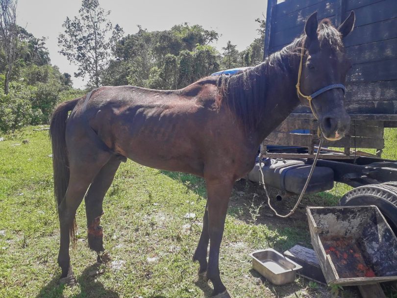 No local informado os agentes localizaram um cavalo macho adulto, da raça quarto de milha, com sinais de desnutrição e com ferimento de grandes proporções na pata traseira esquerda.