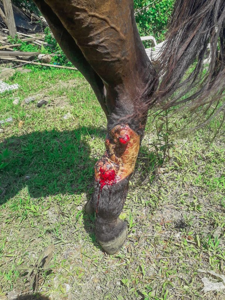 O proprietário do cavalo informou que há acompanhamento de veterinário para tratar a lesão na pata, porém não apresentou nenhum documento que comprovasse os fatos.