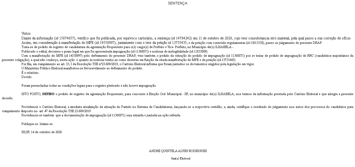 Na sentença o juiz decidiu que foram preenchidas todas as condições legais para o registro pleiteado e não houve impugnação. “Isto Posto defiro o pedido de registro da agremiação Requerente para concorrer à Eleição ORd. Municipal – SP, no município de Ilhabela, nos termos da informação prestada pelo Cartório Eleitoral e que integra a presente decisão”.