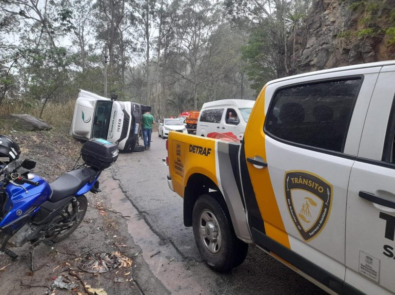 Dois caminhões colidiram na curva entre os bairros de Cigarras e Enseada e até o momento apenas uma vítima teve ferimentos leves.