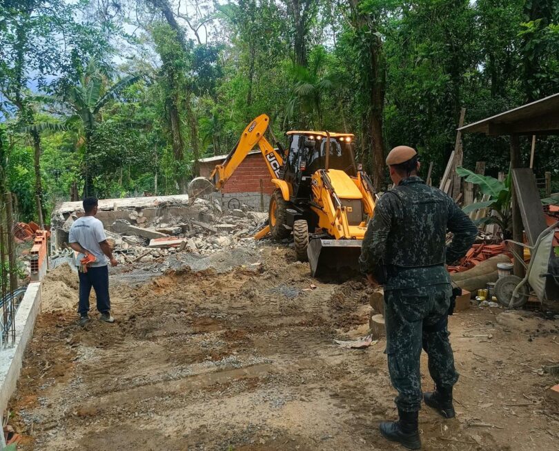 A Polícia Militar Ambiental, em operação conjunta com a Secretaria Municipal de Infraestrutura, realizou na sexta-feira (14), uma ação de fiscalização e demolição de construção irregular localizada às margens de um curso d’água no bairro Rio Escuro, na cidade de Ubatuba – SP.