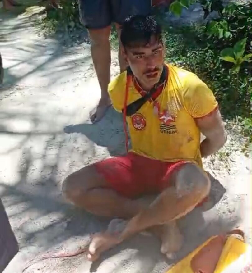 O guarda-vidas alegou que foi ofendido verbalmente pela mulher e seus familiares, inclusive com xingamentos de cunho racial, o que culminou em agressões físicas. E após a intervenção policial e já algemado, ele foi novamente agredido.