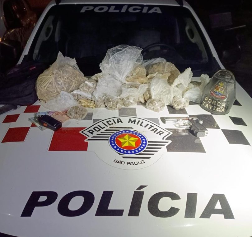 Os militares apreenderam com o individuo uma pistola Taurus 38 de numeração suprimida, com dez munições, a quantia de R$ 140,50 e próximo do matagal localizaram uma grande mochila contendo 2.626 porções de maconha (pesando aproximadamente 6 quilos) e um rádio comunicador pequeno.