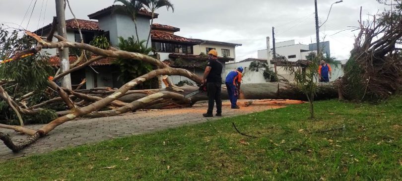 Quatro árvores caíram em ruas do Golfinhos, Pontal Santamarina, Jardim Aruan e Ponte Seca. A ventania derrubou outras duas árvores em residências dos bairros Golfinhos e Massaguaçu, mas ninguém se feriu. Uma igreja, no Jardim Britânia, ficou destelhada e teve a fachada derrubada pelo vento. A Defesa Civil interditou o templo religioso por tempo indeterminado.
