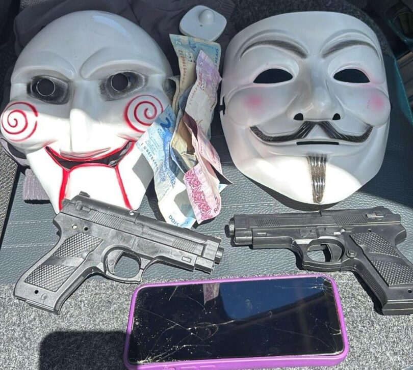 Na abordagem nada de ilícito foi localizado, porém na entrevista um dos criminosos apontou onde estaria a sacola com os simulacros e máscaras.
