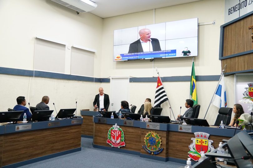 A Câmara Municipal de Caraguatatuba promoveu na noite da última segunda-feira (29), a solenidade de entrega de Título de Cidadão Caraguatatubense ao senhor Gustavo Cursino, Diretor do Hospital Regional do Litoral Norte desde 2019. O presidente da Câmara, vereador Tato Aguilar é o autor do projeto de Decreto Legislativo nº 06/24, que concedeu a homenagem pelos relevantes serviços prestados ao município.