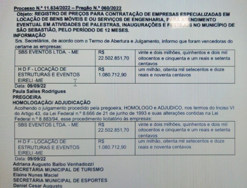 A empresa SBS eventos é especializada em locação de bens móveis e serviços de engenharia e venceu o certame licitatório da prefeitura municipal de São Sebastião em 9 de setembro de 2022.