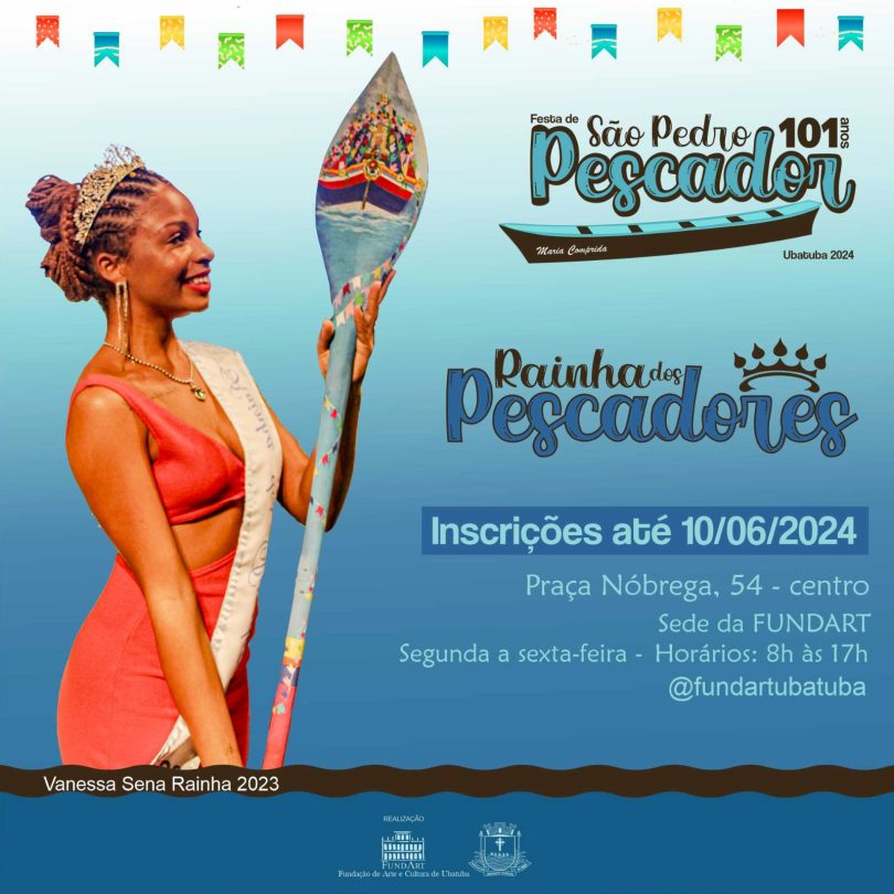 A Fundação de Arte e Cultura de Ubatuba (Fundart) divulgou nesta quarta-feira, 8 de maio, o edital de abertura do concurso de Rainha dos Pescadores da 101a Festa de São Pedro, que será realizada de 27 a 30 de junho.