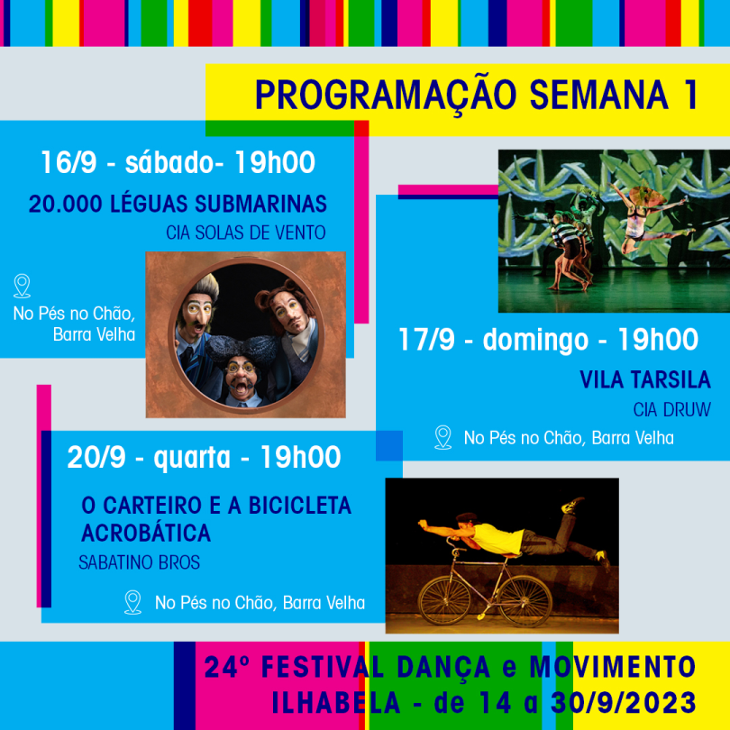 A 24º edição do “Festival Dança e Movimento” traz para Ilhabela 14 espetáculos gratuitos destinados a todas as idades. As apresentações começaram nesta quinta-feira (14) e prosseguem até o dia 30 de setembro, fechando um ciclo de três semanas de exibições com diversos estilos artísticos, indo da arte circense ao teatro e do balé clássico à dança experimental.