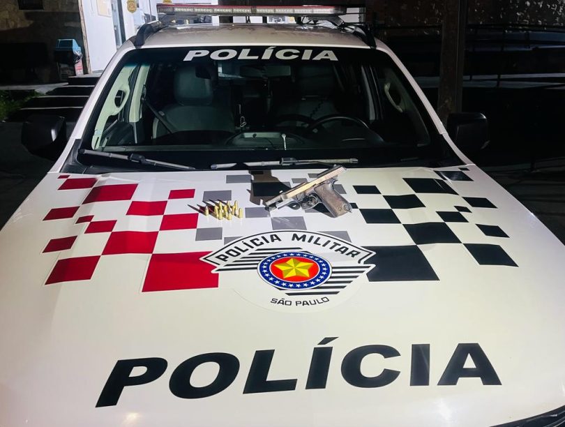Na abordagem os policiais encontraram uma pistola modelo Taurus calibre 9 mm com a numeração suprimida, contendo 10 munições intactas.