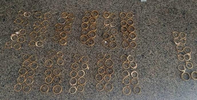 No momento da busca pessoal os policiais encontraram aproximadamente 12 anéis do tipo bijuterias no bolso do indivíduo. Indagado sobre a procedência ele confeçou a autoria do furto e informou que o restante do produto estava em sua residência e indiciou o local onde havia guardado. Foram localizados um total de 122 aneis banhados a ouro, avaliados em aproximadamente R$17.000,00.