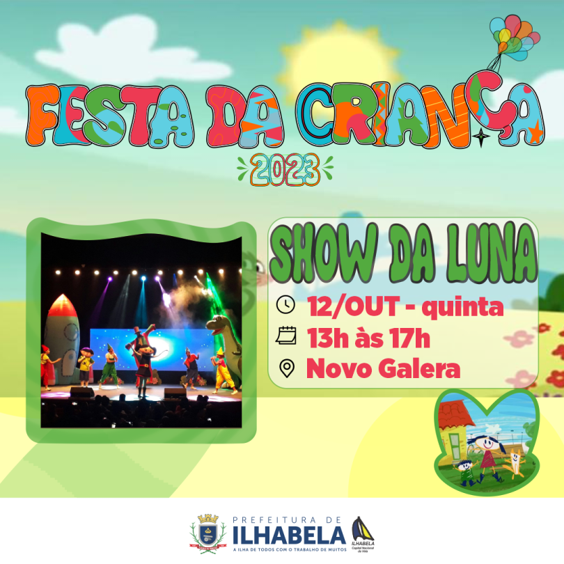 A Prefeitura de Ilhabela prepara um evento especial em comemoração ao Dia das Crianças no dia 12 de outubro. Brinquedos infláveis, comes e bebes, pintura de rosto e o Show da Luna como atração principal estão na programação. O local escolhido para essa celebração é o Novo Galera das 13h às 17h.