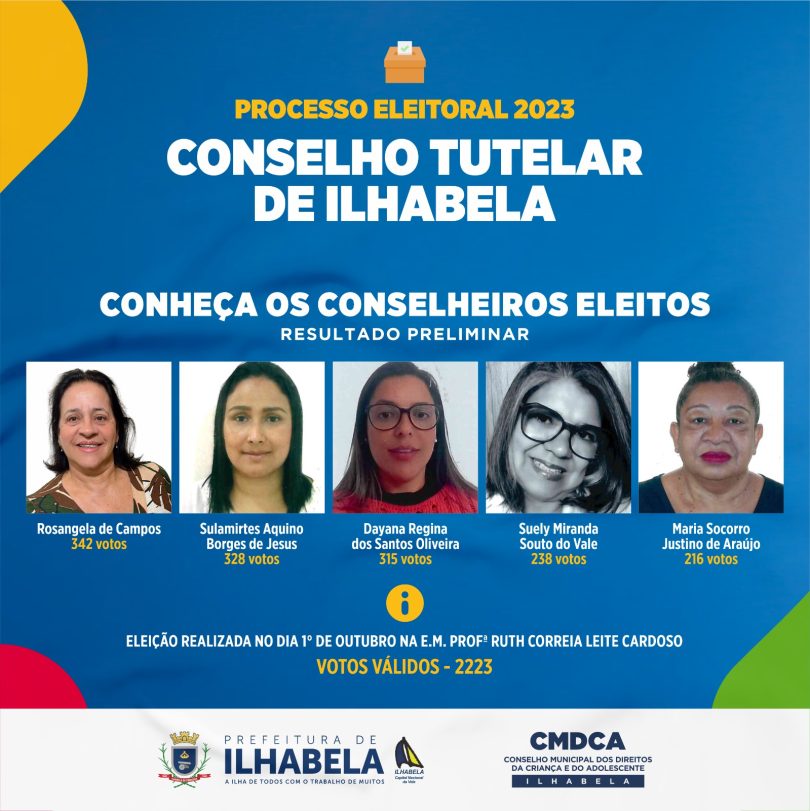 Ilhabela elegeu os novos membros do Conselho Tutelar para a gestão 2024/2027 no último domingo (1º/10). Todo o processo eleitoral foi conduzido pelo Conselho Municipal da Criança e do Adolescente de Ilhabela, com o apoio da Prefeitura, por meio da Secretaria de Desenvolvimento e Inclusão Social e terminou com 2.223 votos válidos e 11 nulos.