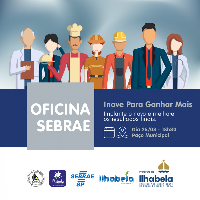 A Prefeitura de Ilhabela, por meio da Secretaria de Desenvolvimento Econômico e do Turismo e do Sebrae Aqui, está com inscrições abertas para as oficinas “Inove para Ganhar Mais” e “Formalização”, que acontecem respectivamente nos dias 25 e 26, às 18h30, no Paço Municipal.