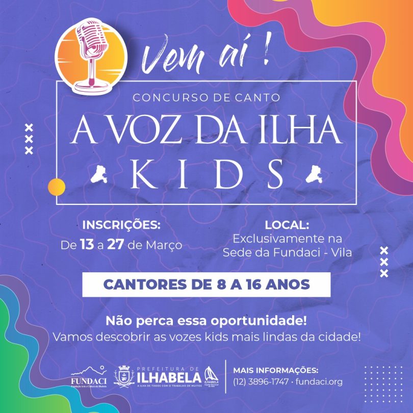 A Prefeitura de Ilhabela informa que as inscrições do concurso “A voz da Ilha Kids” se encerram nesta segunda-feira (27). O concurso é voltado aos intérpretes profissionais ou amadores com idades entre 8 e 16 anos, que se apresentarão na categoria única “solo”.