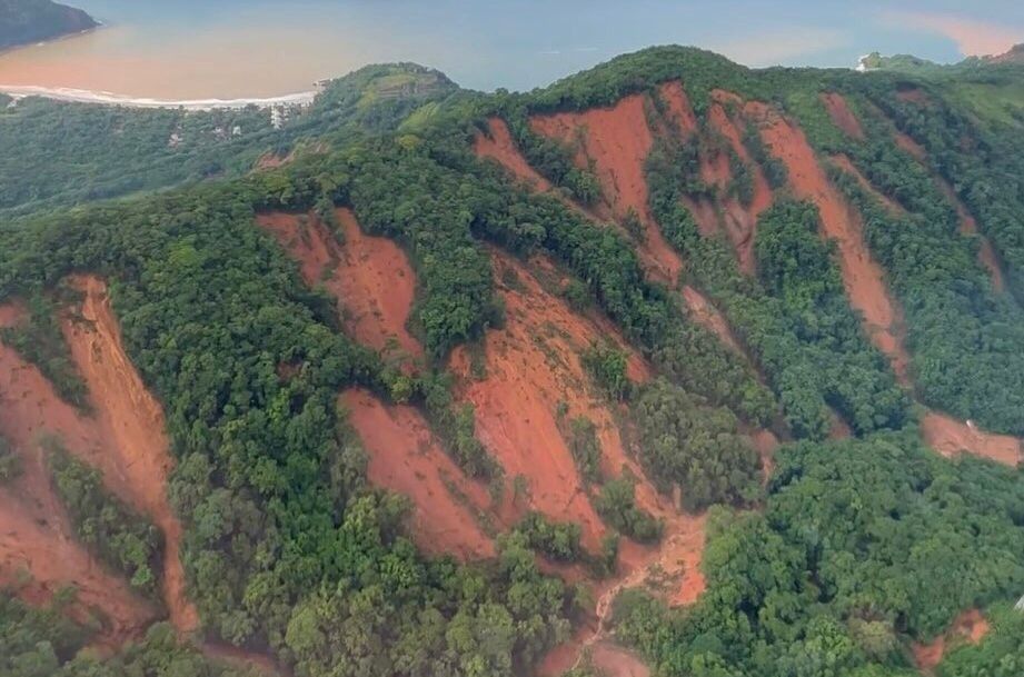 “Além disso, conforme a imagem a seguir, o desastre de São Sebastião deixou sequelas na Serra do Mar, com cicatrizes e perda de vegetação, e áreas de drenagem soterradas, instáveis e que precisarão ser corrigidas para não gerar novos riscos futuros. “Essas áreas já impactadas precisam ser recuperadas com métodos adequados de plantios combinado com bombardeio aéreo com mistura adequada de sementes nativas da Mata Atlântica e plantios manuais, para recuperar a proteção e redução da vulnerabilidade aos riscos de novos escorregamentos nas encostas da Serra do Mar”.