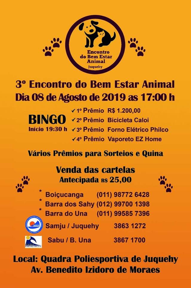 As associações de bairro da Costa Sul de São Sebastião SABU, de Barra do Una representada por sua diretora e protetora Rosana Lobo e SAMJU, Juquehy, representada pela diretora e protetora Nidia Pesce, em parceria com as protetoras independentes Daniela Nunes (Juquehy), Élida Silveira ( Boiçucanga) e Edeni Teresa de Oliveira (Barra do Sahy) promovem o “ 3º Encontro do Bem Estar Animal “ que será realizado na próxima quinta-feira, dia 8, a partir das 17 horas, na quadra poliesportiva de Juquehy.