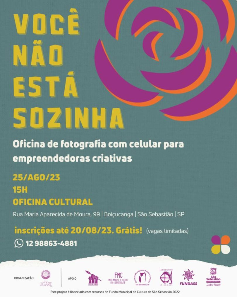 A “oficina de fotografia com celular para empreendedoras criativas” acontecerá dia 25 de agosto às 15h na Oficina Cultural de Boiçucanga, em São Sebastião. Com intuito de potencializar empreendimentos femininos, a atividade faz parte de um conjunto de ações propostas pela Oficina Ligare via Projeto Samininas, realizado por meio do Programa de Fomento Cultural, da Fundação Educacional e Cultural de São Sebastião Deodato Sant’Anna (Fundass).