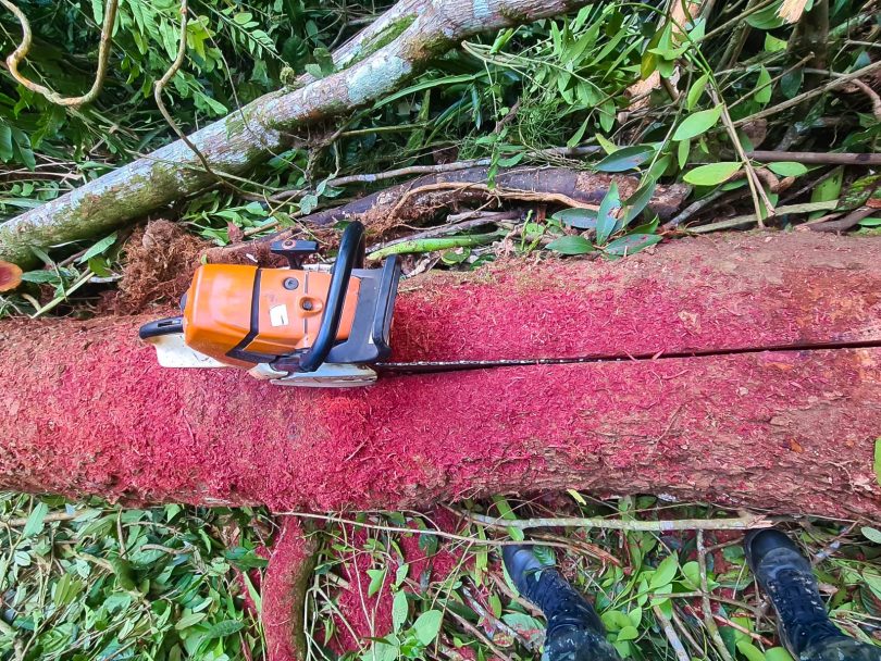 Ao retornarem para apresentação da ocorrência no Distrito Policial, os policiais notaram barulho de motosserra no final da trilha, área fora da Unidade de Conservação, porém dentro da zona de amortecimento do município. Dois homens foram flagrados realizando corte de árvores nativas, totalizando o corte de 13 exemplares arbóreos. Os dois não possuíam licença de porte e uso dos equipamentos, nem autorização para corte das árvores. Devido o crime ambiental os infratores foram autuados em mais de R$ 10.000,00.