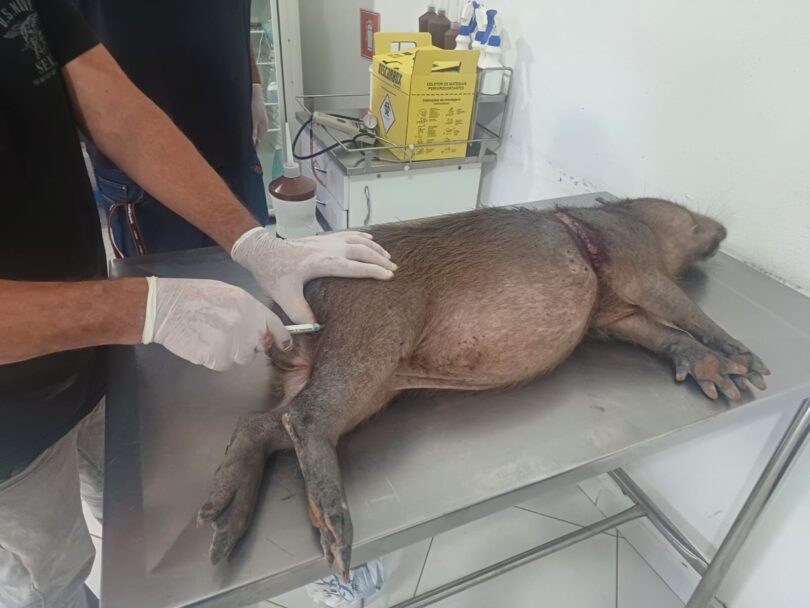 Utilizando técnicas adequadas de captura e manejo, as equipes efetuaram a contenção do aludido animal que, conforme constatado, apresentava ferimentos e um cordão envolto ao corpo, possivelmente decorrentes de tentativas de caça irregular.