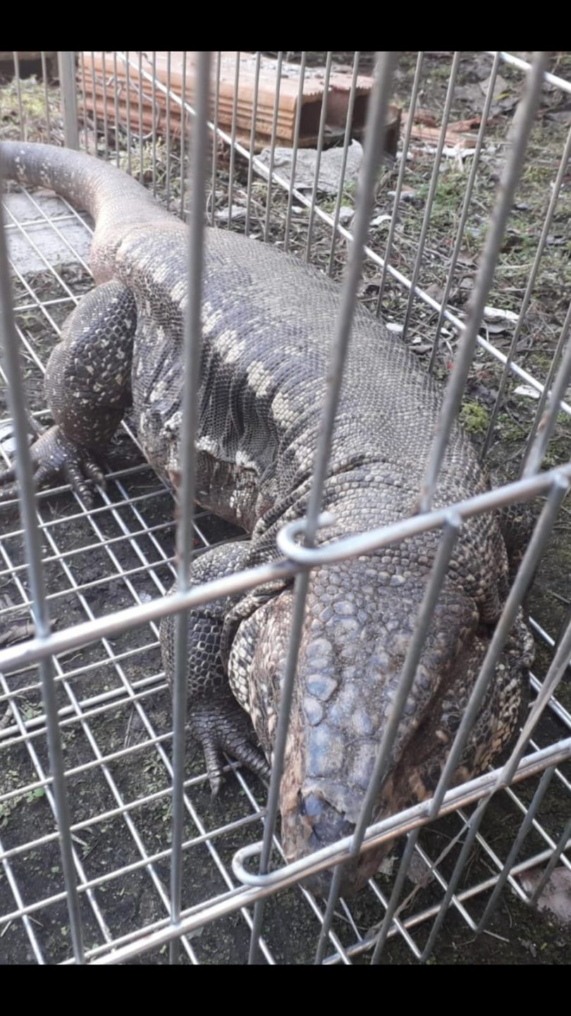 “O Teiú pode atingir até 2 metros de comprimento, incluindo a cauda, eles costumam se alimentar de folhas, frutos, insetos, ovos, pequenos roedores e aves. Quando acuados podem ser agressivos, por este motivo não tentem capturar este animal”