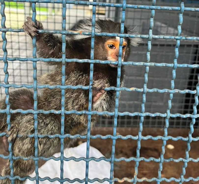 No local, os militares identificaram um Sagui-de-tufo-branco (Callithrix-jacchus) bastante agitado e acondicionado em um viveiro.