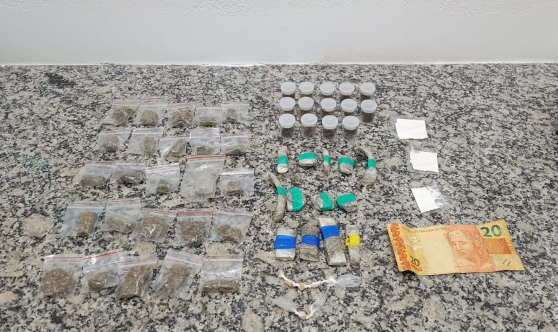 Durante averiguação de denúncia anônima de tráfico de drogas, ao entrarem na rua os policiais avistaram um indivíduo segurando uma sacola plástica na mão, que ao perceber a presença da viatura policial tentou correr para dentro de uma residência, porém, foi abordado no portão. Na sacola que carregava foi localizada 52 porções de maconha, 03 papelotes de cocaína e 06 pedras de crack, e durante a busca pessoal foi encontrado ainda em seu bolso a quantia de R$ 20,00. Ao ser indagado, confessou que estava comercializando as drogas naquele local.