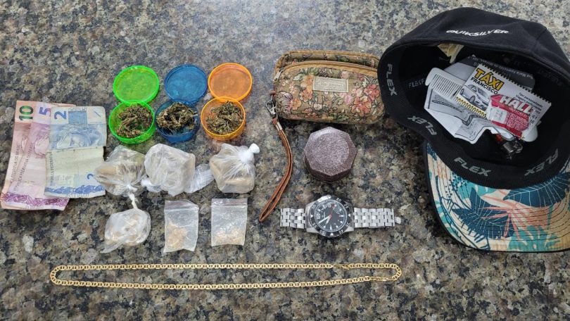 Os militares ao realizarem a abordagem localizaram 39 microtubos de cocaína, 13 porções de crack, 02 embalagens contendo crack, 03 embalagens contendo maconha e R$17,00 em espécie. Na consulta criminal através do COPOM, constataram um mandado de prisão em seu desfavor pelo crime de roubo.