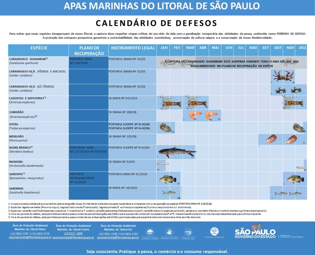 O Policiamento Ambiental realizou nos dias 08 e 09 de novembro, uma operação de fiscalização nos entrepostos de pesca dos municípios de Caraguatatuba, São Sebastião, Ilhabela e Ubatuba, além dos comércios de peixes locais e embarcações de pesca, em razão do defeso das seguintes espécies: 1. Caranguejo-Uça; 2. Lagosta e Sapateira; 3. Mexilhão; 4. Garoupa; 5. Sardinha.