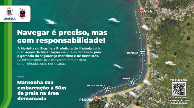 A Prefeitura de Ilhabela e a Marinha do Brasil lançaram a campanha “Navegar é preciso, mas com responsabilidade”. O objetivo é garantir a segurança marítima e de banhistas que se refrescam em áreas próximas às de circulação de embarcações. Para isso, fiscalizações serão feitas nas áreas demarcadas pela Marinha do Brasil como de segurança aos banhistas (50 metros da faixa da areia).