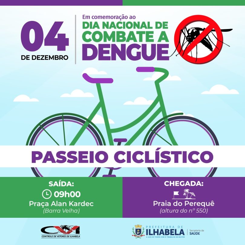 A Prefeitura de Ilhabela realizará no próximo sábado (4/12) o passeio ciclístico em comemoração ao Dia Nacional de Combate à Dengue, que aconteceria no penúltimo sábado do mês de novembro e em decorrências das condições climáticas, foi reagendado.