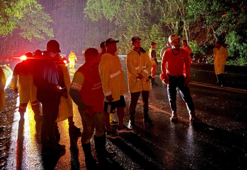 A travessia ocorre com o acompanhamento da Polícia Rodoviária Estadual e de equipes do Departamento de Estradas de Rodagem (DER), que seguem atuando na limpeza da pista e na avaliação técnica da encosta, que permanece encharcada.