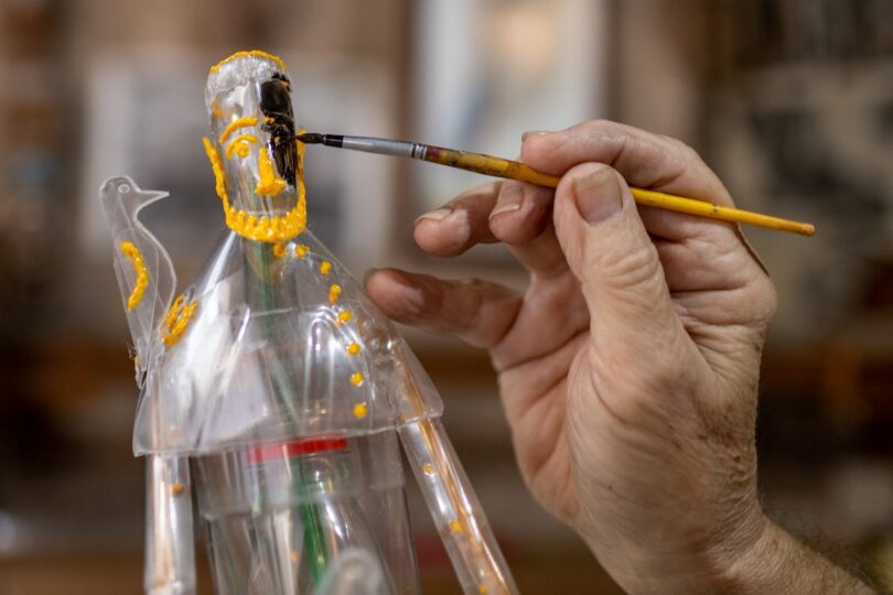 Nas mãos do artesão, uma garrafa de plástico de dois litros se transforma em obras de personagens icônicos como Sancho Pança e Dom Quixote, além de animais, folhas, flores e figuras religiosas como São Francisco de Assis. Tudo feito com muita paciência, técnica e paixão a partir de um material que demora centenas de anos para se decompor.