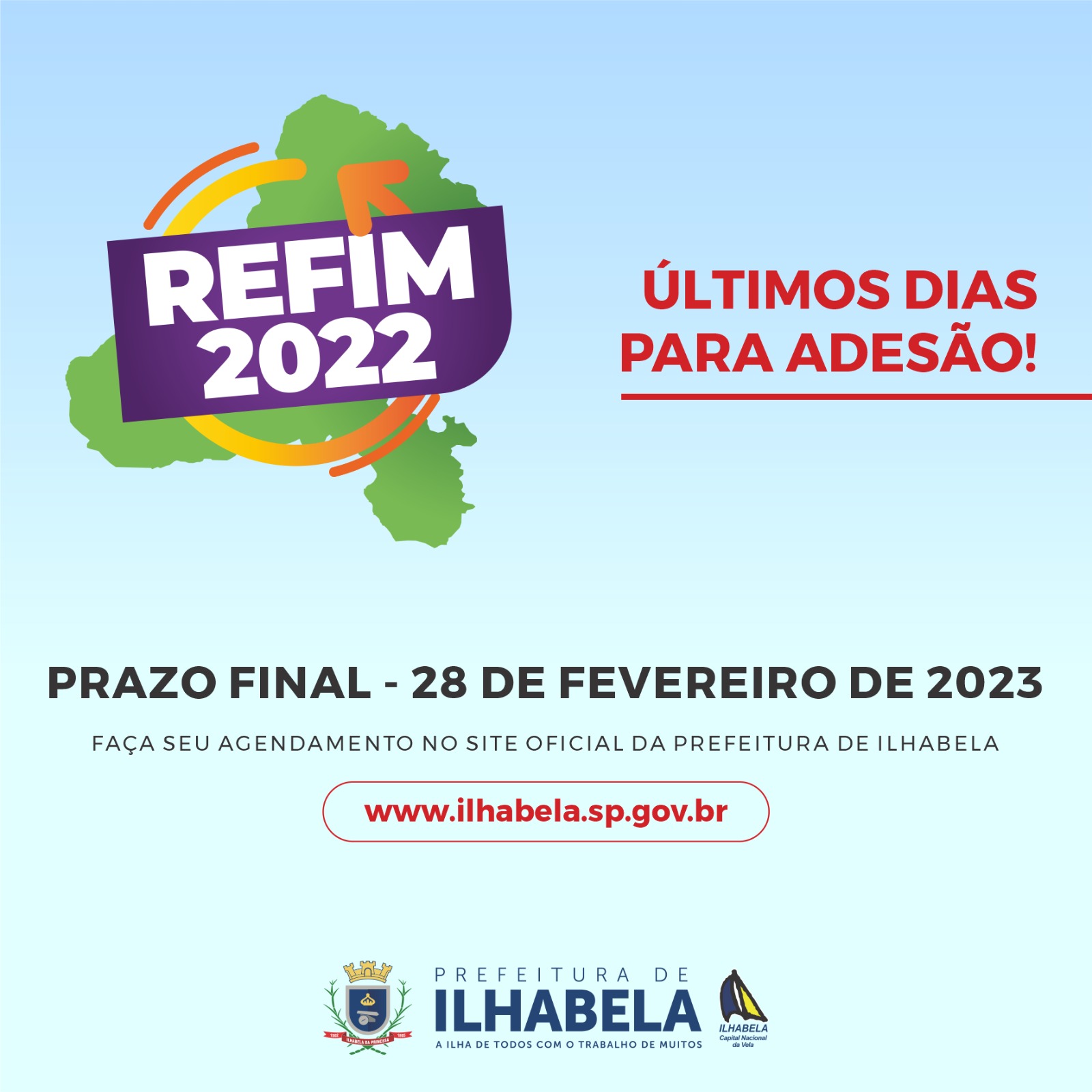 Vale lembrar que os atendimentos são realizados somente com agendamento prévio, ou por e-mail. Os interessados em quitar seus débitos devem acessar o site: http://www.ilhabela.sp.gov.br/, clicar no banner do Refim 2022 e escolher entre as opções de atendimento: Via Verde ou e-mail.