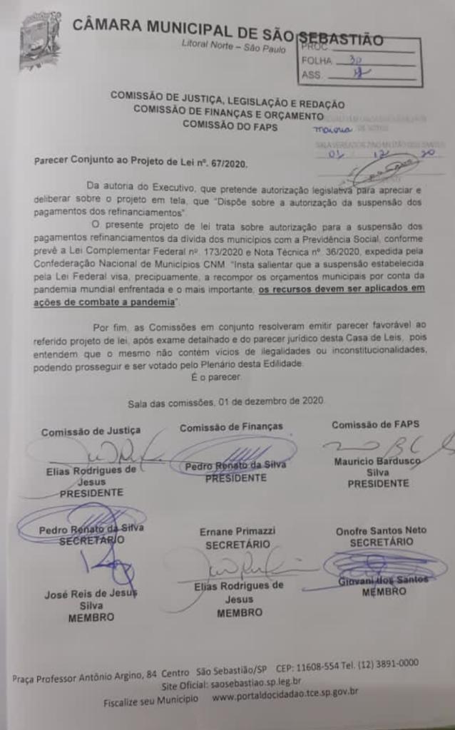 O parecer conjunto das comissões de Justiça, de Finanças e do Fundo de Aposentadoria e Pensões dos Servidores de São Sebastião (FAPS), favorável ao Projeto de Lei, não foi assinado por Ernaninho (secretária da comissão de Finanças) e nem pelo vereador Neto (secretário da comissão do FAPS).
